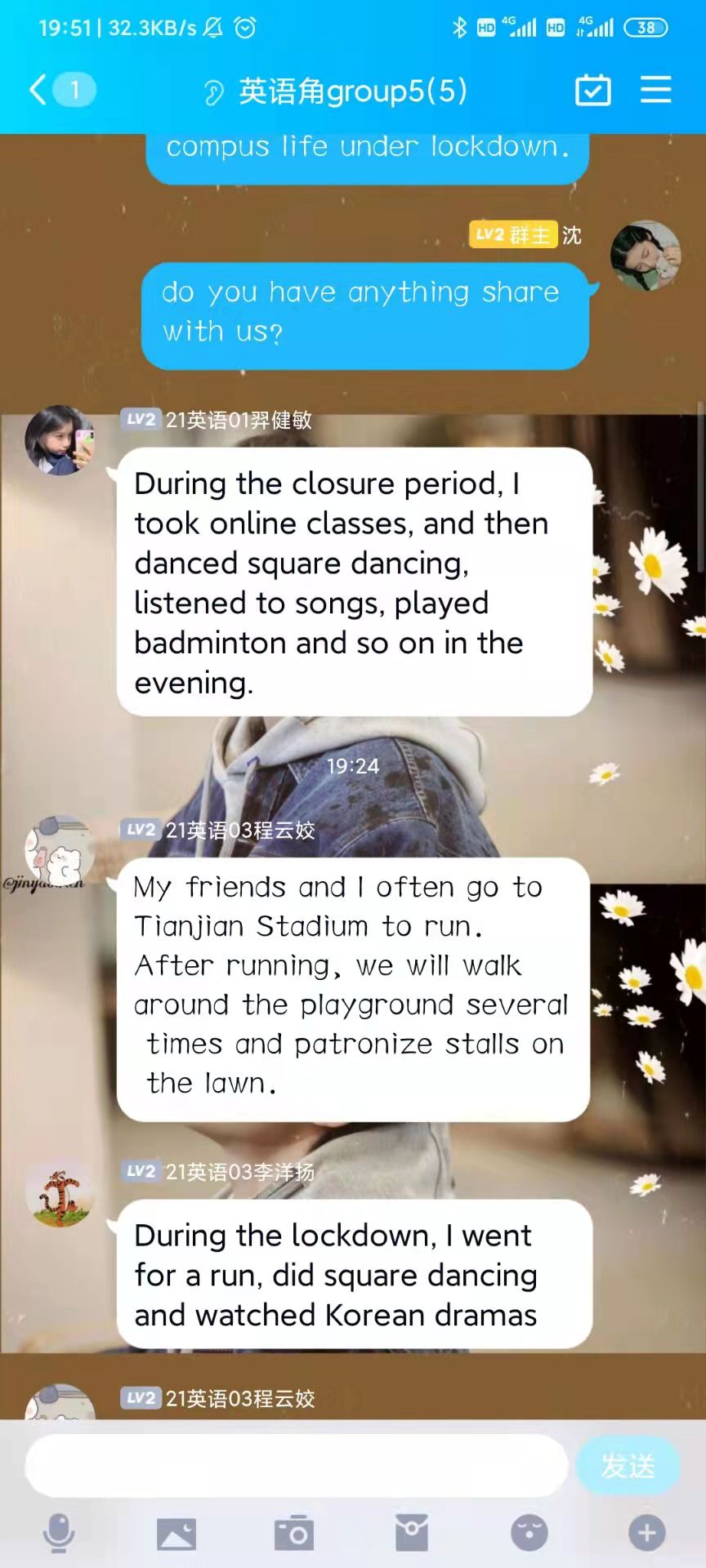 在Freetalk环节,同学们畅所欲言、各抒己见,激烈且认真地讨论着自己对相关问题的看法。而线上会场的每位志愿者则带领小组成员在各自的QQ群里发表了疫情期间自己的社交日常以及扩大社交圈的一些方法。其中,21旅管03朱慧玲同学分享了自己的日常如锻炼、听音乐等,很多同学都在过程中分享了自己的生活趣事,同学们积极在评论区互动讨论。
