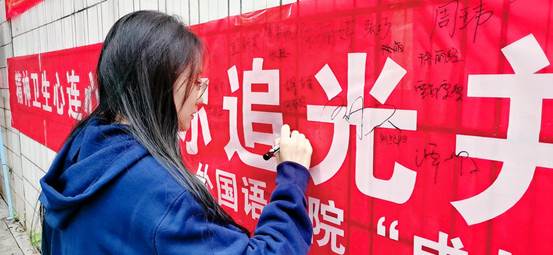 在绿丝带活动进行的同时,“水墨有意,笔下传情”横幅签名及微信推送转发活动也在如火如荼地进行中。“成长氧吧”辅导室在维智大道和宁静路悬挂了“精神卫生心连心,与你追光并前行”,“日子很滚烫,又暖又明亮”和“九月的风留在九月底,见面的人相约精卫日”的横幅 ,宣传精神卫生活动日,倡导大家关注并重视心理健康。大家纷纷在横幅上签名,并在微信上转发了外国语学院“与心灵相约,让青春远航”的宣传推送,让更多人的人了解精神卫生活动日。