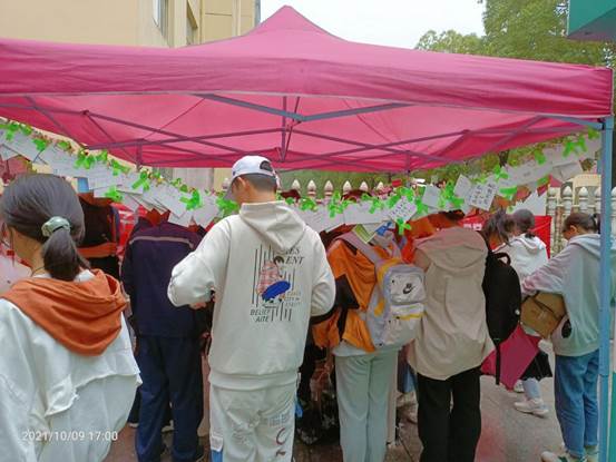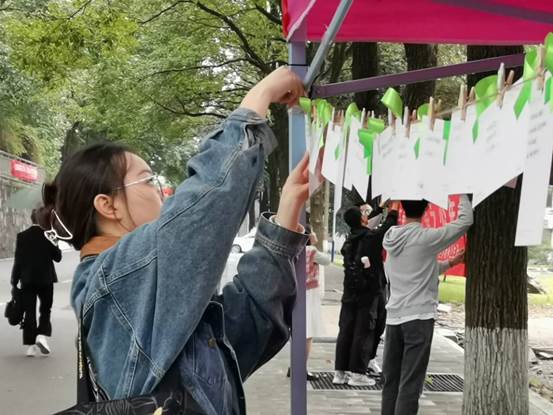 从十月九日中午一点开始,绿丝带系挂活动在维智大道和宁静路同步进行。外国语学院心理部提前为大家准备了象征中国精神卫生标志的绿丝带和温馨的卡片。活动现场,工作人员指引参与活动的同学们在明信片上写下正能量的话语,将绿丝带贴于明信片右上角,并悬挂于准备的细线之上。每个活动的参与者都成为了一名光荣的绿丝带推广大使。秋风虽寒,但明信片上热情洋溢的寄语和代表着健康、积极、向上的绿丝带将阵阵的暖意吹入了每个人心中。这些话语,这阵暖意,将伴随着长大学子共建美好的精神家园。