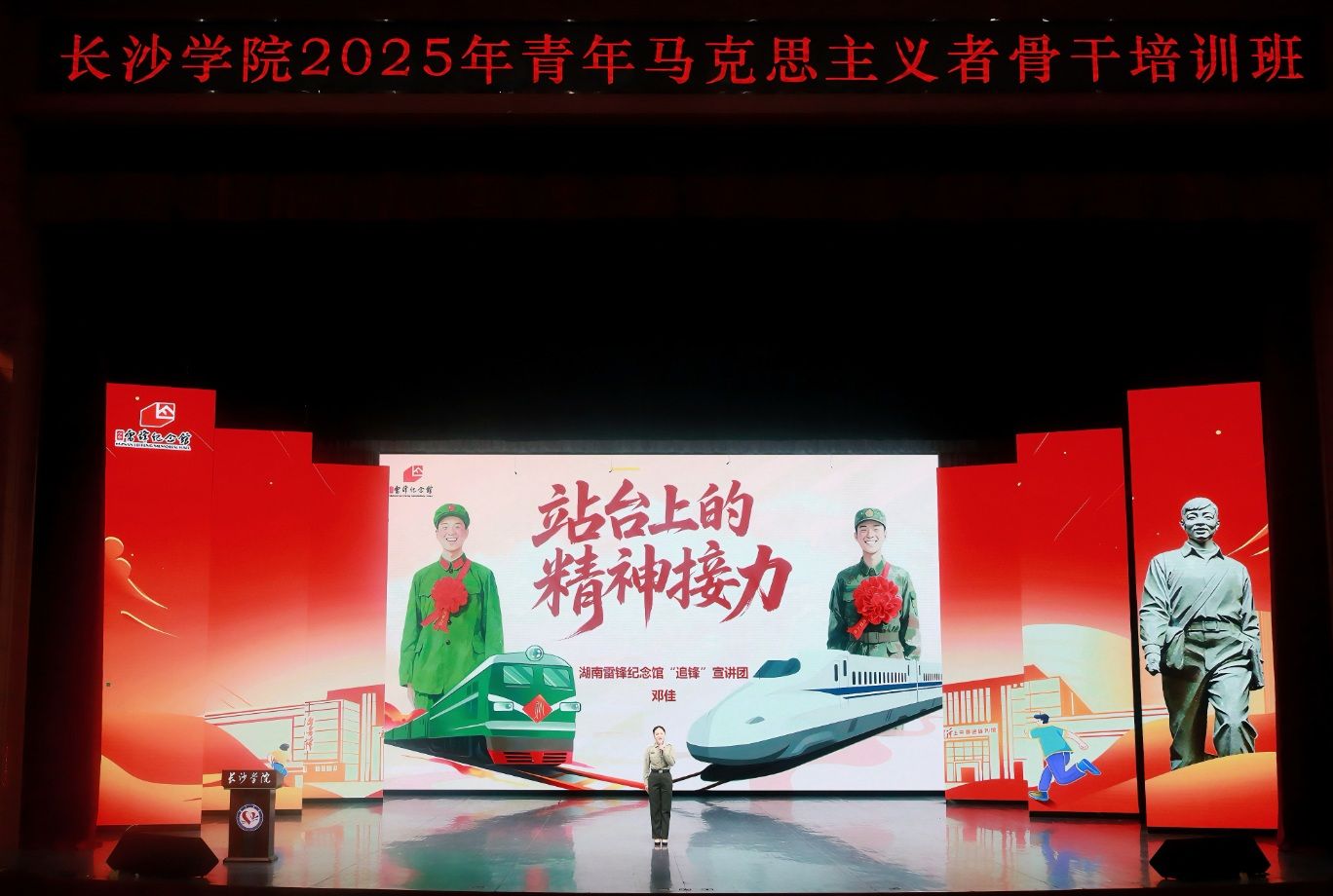 2025年10月21日下午,长沙学院学生活动中心气氛庄重、掌声不断。由校团委主办、校学生会承办、外国语学院协办的2025年“青马班”开班第一课在此隆重举行。本次课程特邀湖南雷锋纪念馆追“锋”宣讲团与外国语学院双语宣讲团联合授课,以外语讲述中国故事,用青春传递信仰力量,打造了一堂有深度、有温度、有特色的“外语+思政”融合课堂。湖南雷锋纪念馆党组书记邹文、长沙学院团委书记尹方园、团委副书记梁莉、外国语学院党总支副书记刘琼、团总支书记刘桢与全体“青马班”学员一同,共同聆听了这堂意义深远的双语思政课。