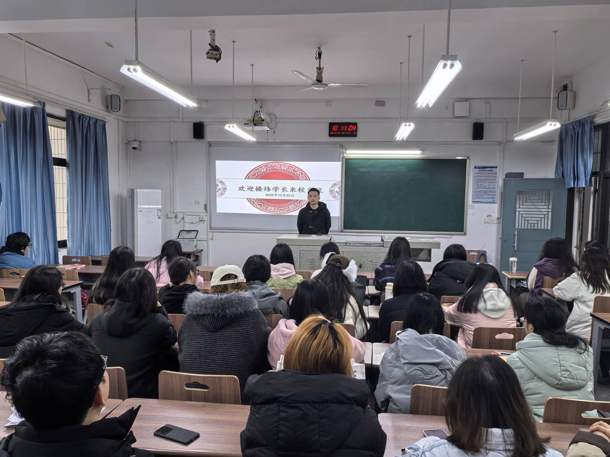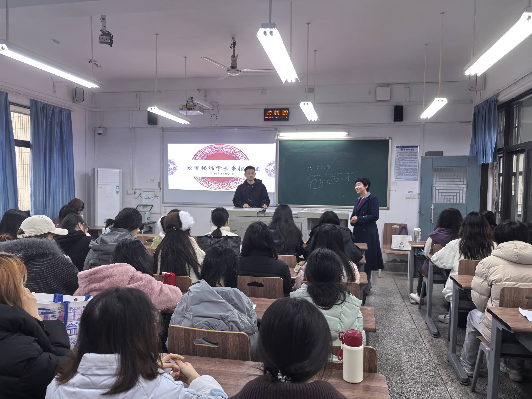 12月23日,2013级日语专业校友楼炜受邀返校,以“突破边界·多元成长”为主题,为23级日语专业的学弟学妹们带来了一场关于学业规划、职业发展与人生选择的精彩分享。从校园文体骨干到日本名校硕士,再到四大会计师事务所资深顾问,楼炜用十年奋斗历程诠释了“语言+”复合型人才的成长范式。