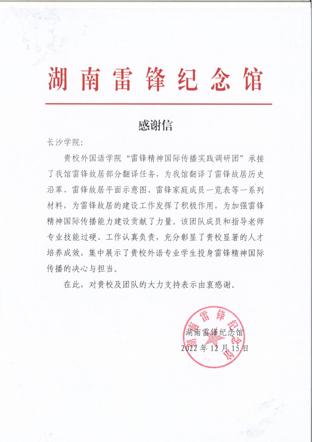 近日,湖南雷锋纪念馆向我院发来感谢信,对我院“雷锋精神国际传播实践调研团”在加强雷锋精神国际传播能力建设、提升雷锋精神海外传播力和影响力等方面作出的积极贡献表示充分肯定和衷心感谢。