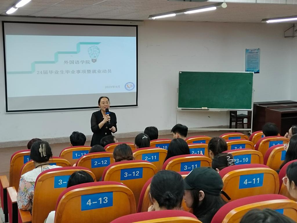 9月14日,外国语学院于宁静楼T2召开2024届毕业生大会。出席本次会议的嘉宾有外国语学院党总支书记刘秋菊、党总支副书记刘琼、学工办主任陈茂、20级辅导员曾令佩。