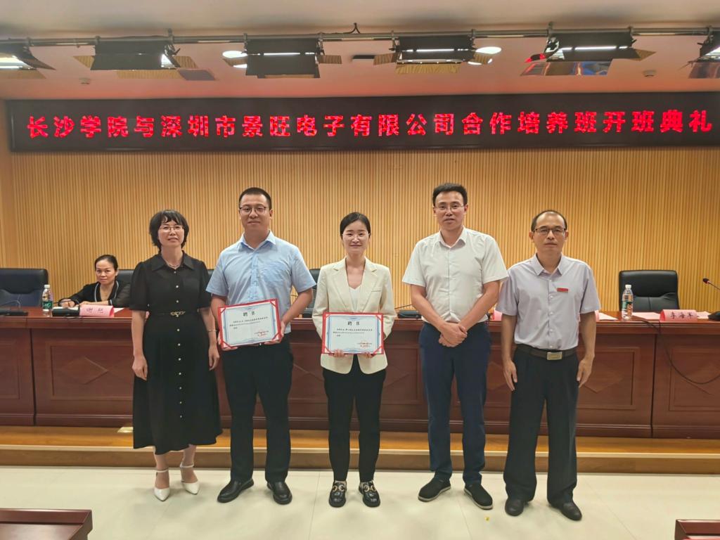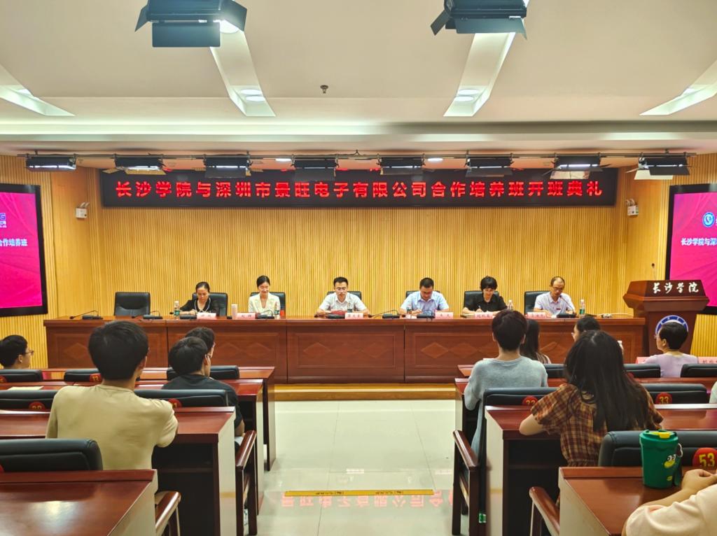 2024年9月20日,长沙学院与深圳市景旺电子有限公司合作培养班的启动仪式在学校图书馆一楼报告厅隆重举行。长沙学院招生与就业指导处处长黎文普、副处长谢艳,外国语学院院长李海军、党总支书记刘秋菊,景旺电子有限公司人力资源总监王文、人力资源经理刘辉参加开班仪式。