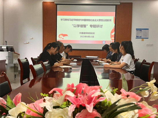 6月13日上午,根据学习贯彻习近平新时代中国特色社会主义思想主题教育相关部署,外国语学院理论学习中心组在宁静楼3-6会议室开展“以学增智”专题学习研讨,会议由党总支书记刘秋菊主持,学院全体班子成员和各党支部书记参加。