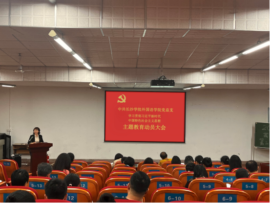 2023年4月18日,外国语学院党总支在宁静楼T2召开学习贯彻习近平新时代中国特色社会主义思想主题教育动员部署大会。学院党总支书记刘秋菊主持大会,并作动员讲话。外国语学院全体师生党员参会。