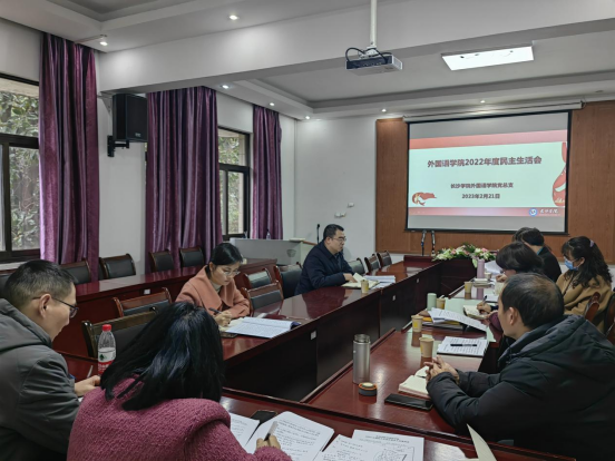 外国语学院于2023年2月21日在宁静楼3-6召开2022年度民主生活会,党总支书记刘秋菊主持会议,班子成员全体参加,分工会负责人、科级干部和党支部书记列席。党委委员何利华同志到会指导。