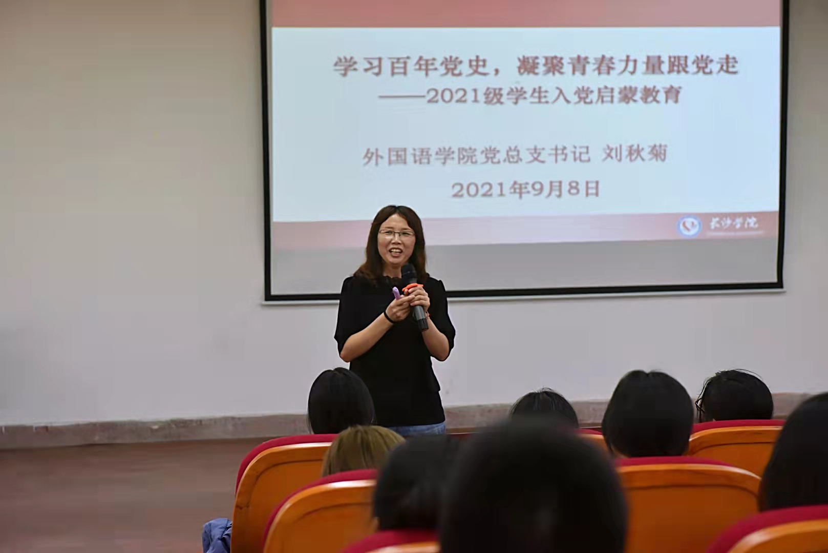 9月8日上午,外国语学院党总支书记刘秋菊在宁静楼T2为新生开展了入党启蒙教育,给新生上了一堂思政课。2021级全体新生和班导共300余人参加学习。