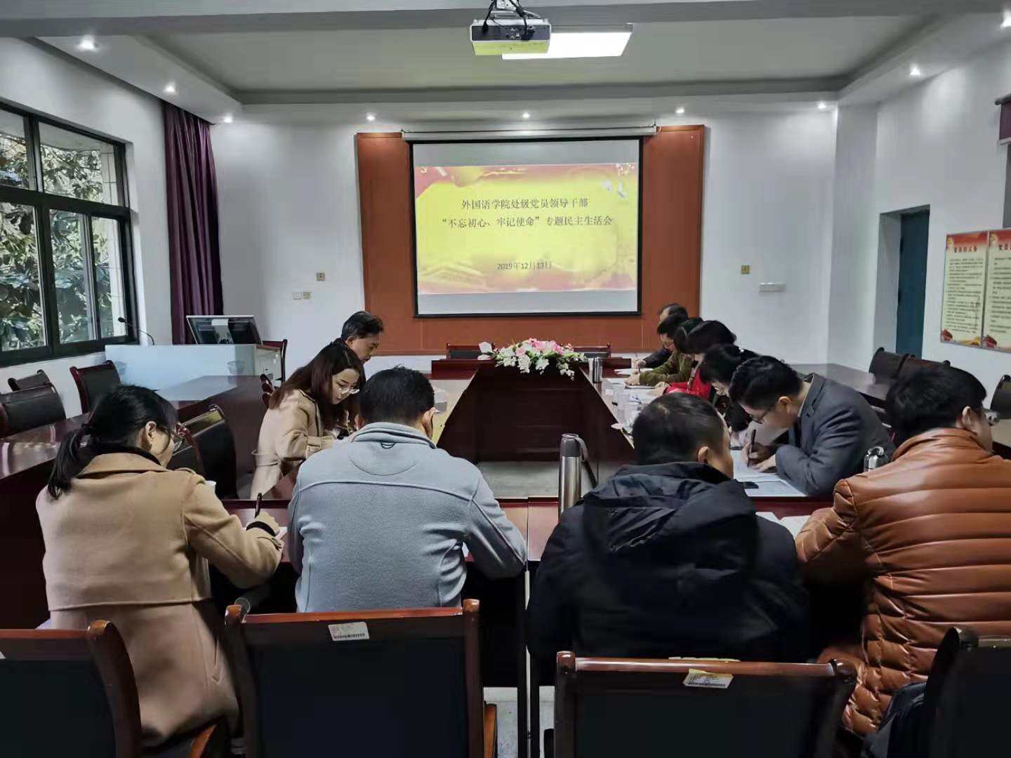 2019年12月13日上午,外国语学院在宁静楼3-6召开了“不忘初心、牢记使命”处级党员领导干部专题民主生活会,会议由党总支书记刘秋菊主持,处级党员领导干部3人出席会议,党外处级干部、专职组织员、分工会负责人、科级干部、党支部书记共计10人列席会议。学校党委派出党委委员、副校长刘世昌同志和党政办姜浪同志参会,刘世昌副校长到会指导。