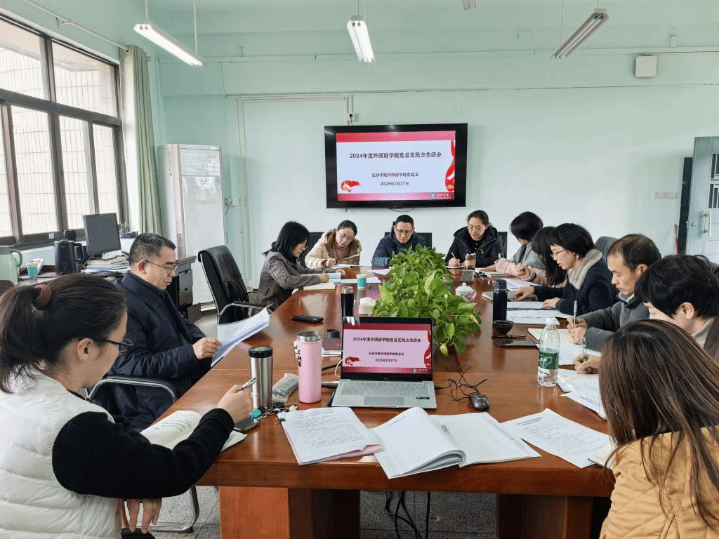 外国语学院党总支于2025年2月27日在宁静楼5-1召开2024年度民主生活会,党总支书记刘秋菊主持会议,班子成员全体参加,分工会负责人、科级干部和党支部书记列席。党委委员何利华同志到会指导。