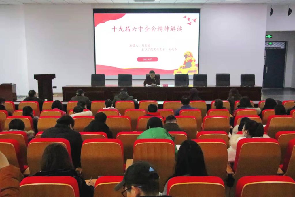 为深入学习贯彻十九届六中全会精神,扎实推进党史学习教育,2022年1月7日上午,党委委员、副校长胡石明在长智楼C501会议室讲授十九届六中全会精神专题党课,外国语学院全体党员教师参加。