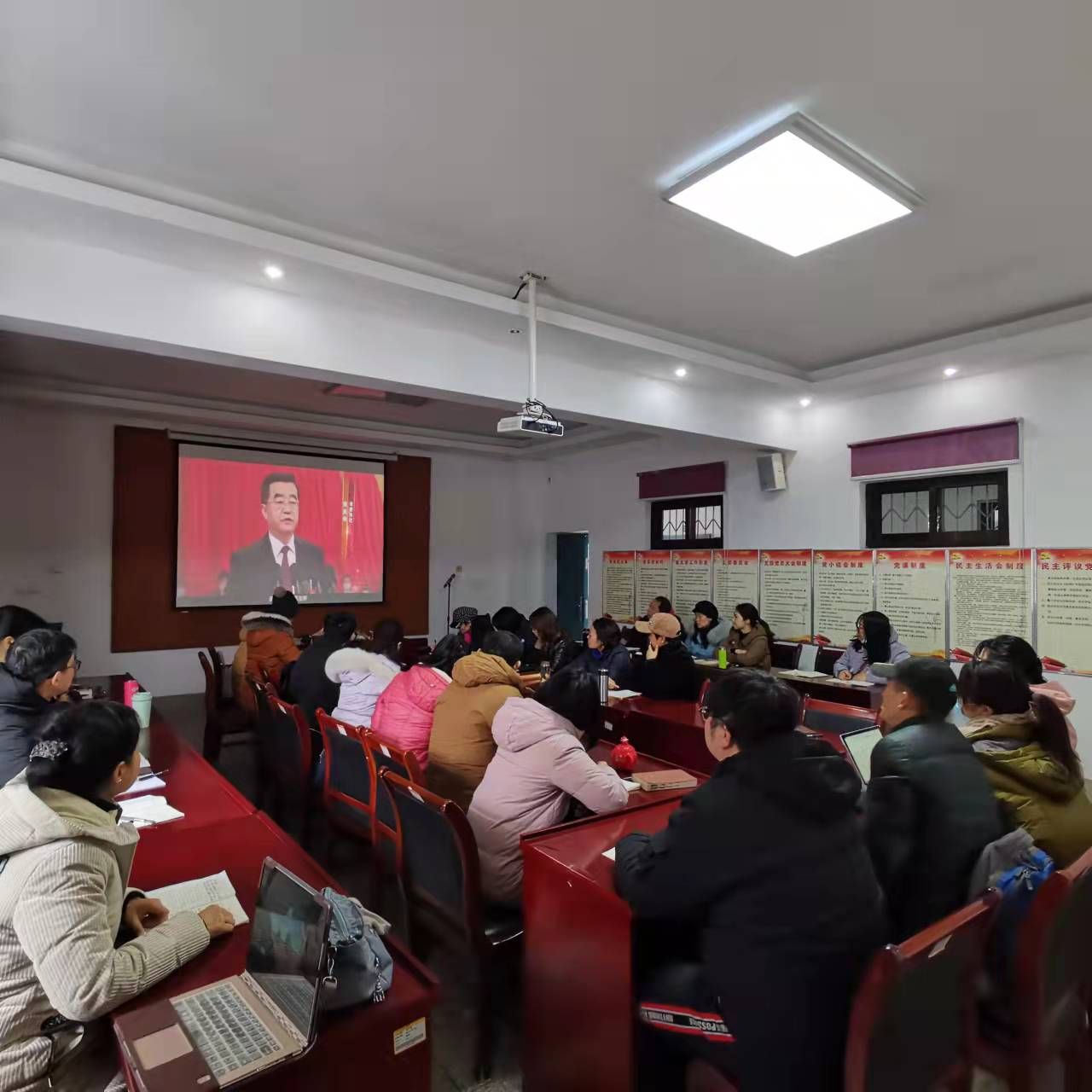 2021年12月27日上午,外国语学院全体教师党员在宁静楼3-6、全体学生党员和部分入党积极分子在宁静楼4-1集中观看了《奋斗新征程 谱写新篇章--深入学习宣传贯彻省第十二次党代会精神》党员教育电视片,之后组织师生党员入党积极分子观看了廉政教育片《正风反腐在身边》第一集《政治监督》。