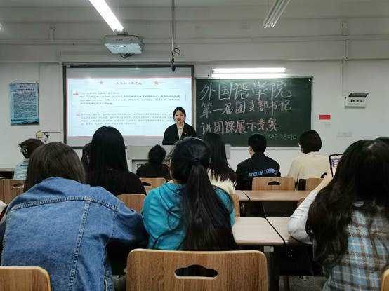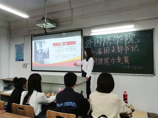 建党百年之际,为深入贯彻学习习近平新时代中国特色社会主义思想,全面贯彻习近平总书记关于青年工作的重要思想,提高团员青年对基层团组织的认同感和归属感,充分发挥优秀团干部的先锋模范作用,外国语学院于2021年3月29日晚上7点在宁静楼4-1举办了“高举团旗跟党走,青春建功新时代”第一届团支部书记讲团课展示竞赛。出席本次活动的成员有团总支书记赵琼、18-20级全体团支书及部分团学干部。本次活动由20英语02班李雨晴主持。