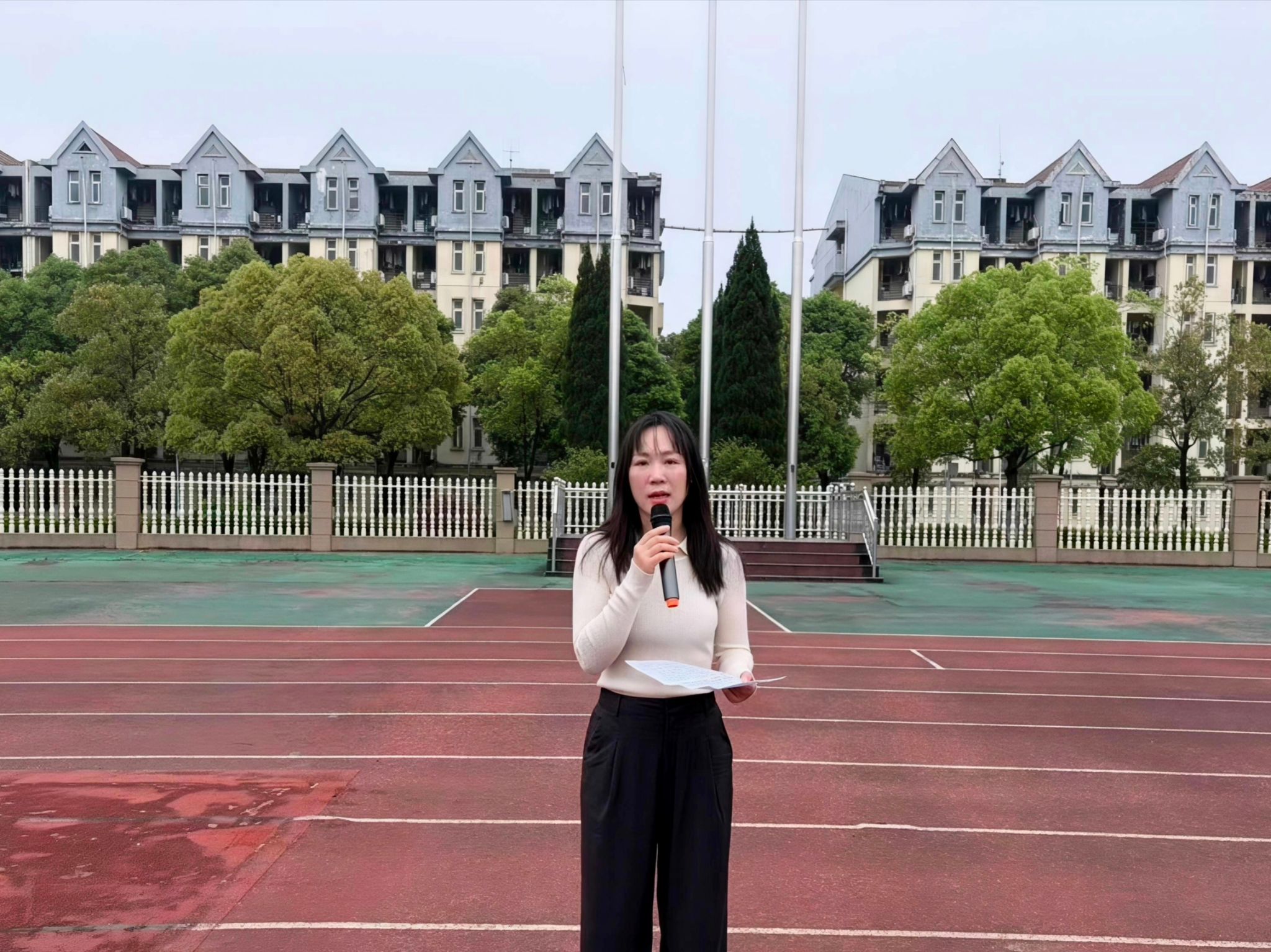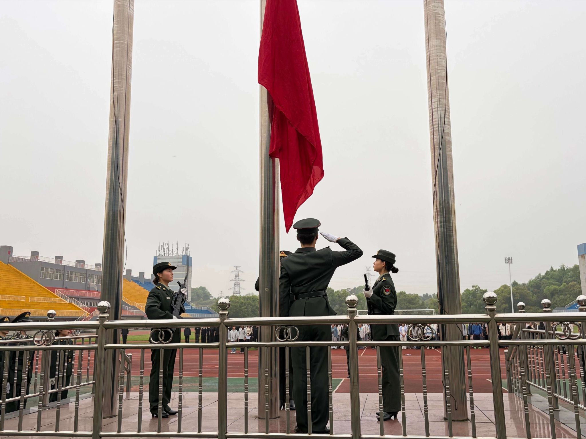 2026年4月13日清晨,外国语学院全体师生在天健体育场举行“用世界语言,讲好中国故事”主题升旗仪式。简短升旗后,现场开展了生动的微团课。学院党总支书记刘秋菊、副书记刘琼及全体辅导员、学生共同参加,升旗仪式由团总支副书记胡雅丽同学主持。
