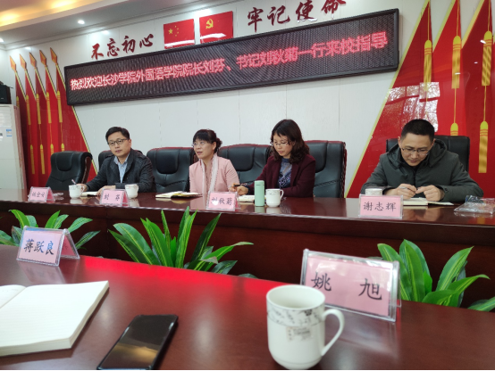 为进一步促进高校与高中间的交流与合作,外国语学院党总支书记刘秋菊、院长刘芬、副院长谢志辉、学工办主任姚金安一行4人于4月7日走进宁乡市第六高级中学和宁乡第七高级中学,与两所学校校领导就实习基地、志愿服务基地和优质生源基地建设等相关事宜进行磋商。