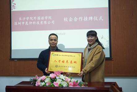 2021年4月1日,深圳市昆仲科技有限公司与外国语学院正式签署合作共建人才培养基地协议。深圳市昆仲科技有限公司创始人兼CEO匡才发先生携6名高管、外国语学院党总支书记刘秋菊、院长刘芬、副院长谢志辉以及学工办主任姚金安参加授牌仪式。