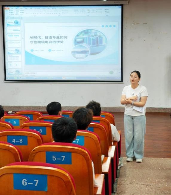 长沙市浩宏科技有限公司客服推广业务骨干刘佳则围绕“AI时代,日语专业如何保持跨境电商优势”展开分享。她结合行业现状,探讨了人工智能对语言服务行业的冲击与机遇,并指出:“跨境电商仍需要具备语言能力、市场洞察力和客户服务思维的复合型人才,建议同学们在学好日语的同时,掌握数据分析、数字营销等实用技能。”