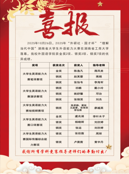 我校参赛团队团结一致、奋勇拼搏,最终夺得金奖2项,银奖3项,铜奖7项。其中22级翻译专业陈逸凡同学获得笔译赛项国赛资格,实现了我校在此赛项上的突破。